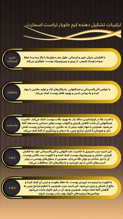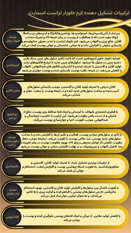 - سیستم بازسازی هوشمند ۳۶۰ درجه: این کرم حاوی عصاره خاویار رویال غنی از پپتیدها، اسیدهای چرب و ویتامینهای قوی بوده که با واسطه تکنولوژی میکروکپسولاسیون و با داشتن سیستم بازسازی هوشمند، به صورت عمقی به داخل پوست نفوذ کرده و با افزایش رشد سلولهای جدید و ترمیم سلولهای آسیب دیده، ماتریکس خارج سلولی را استحکام بخشیده و پوست را جوان و شاداب میسازد.
